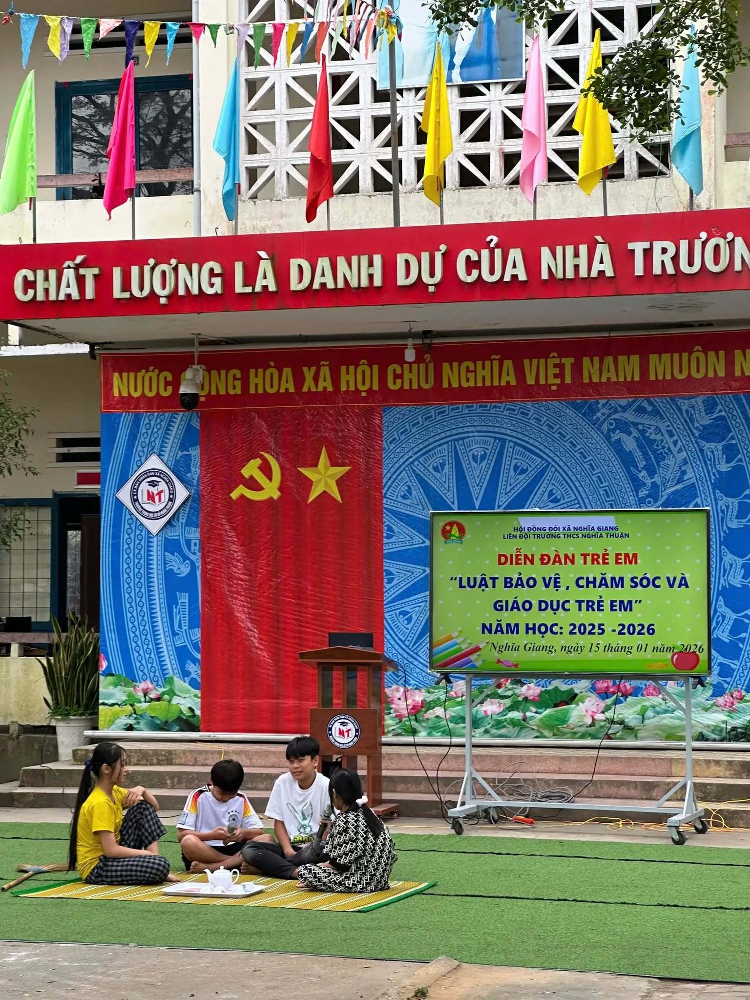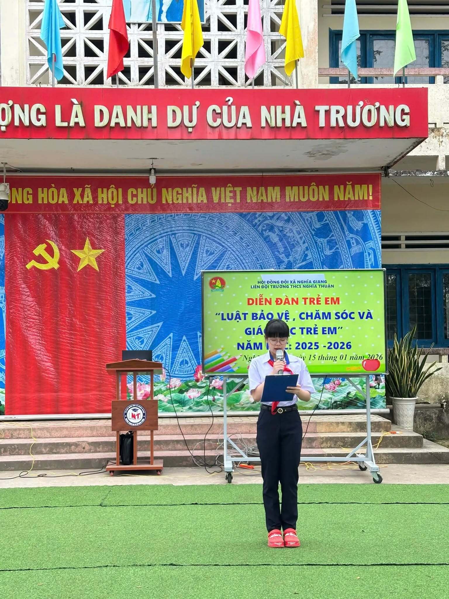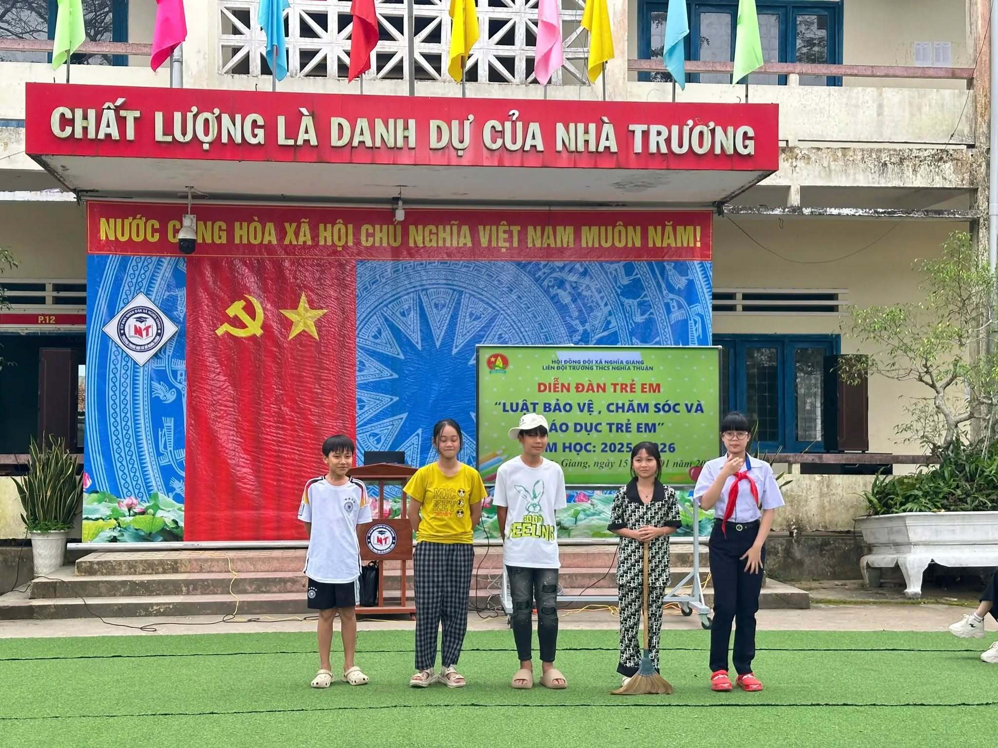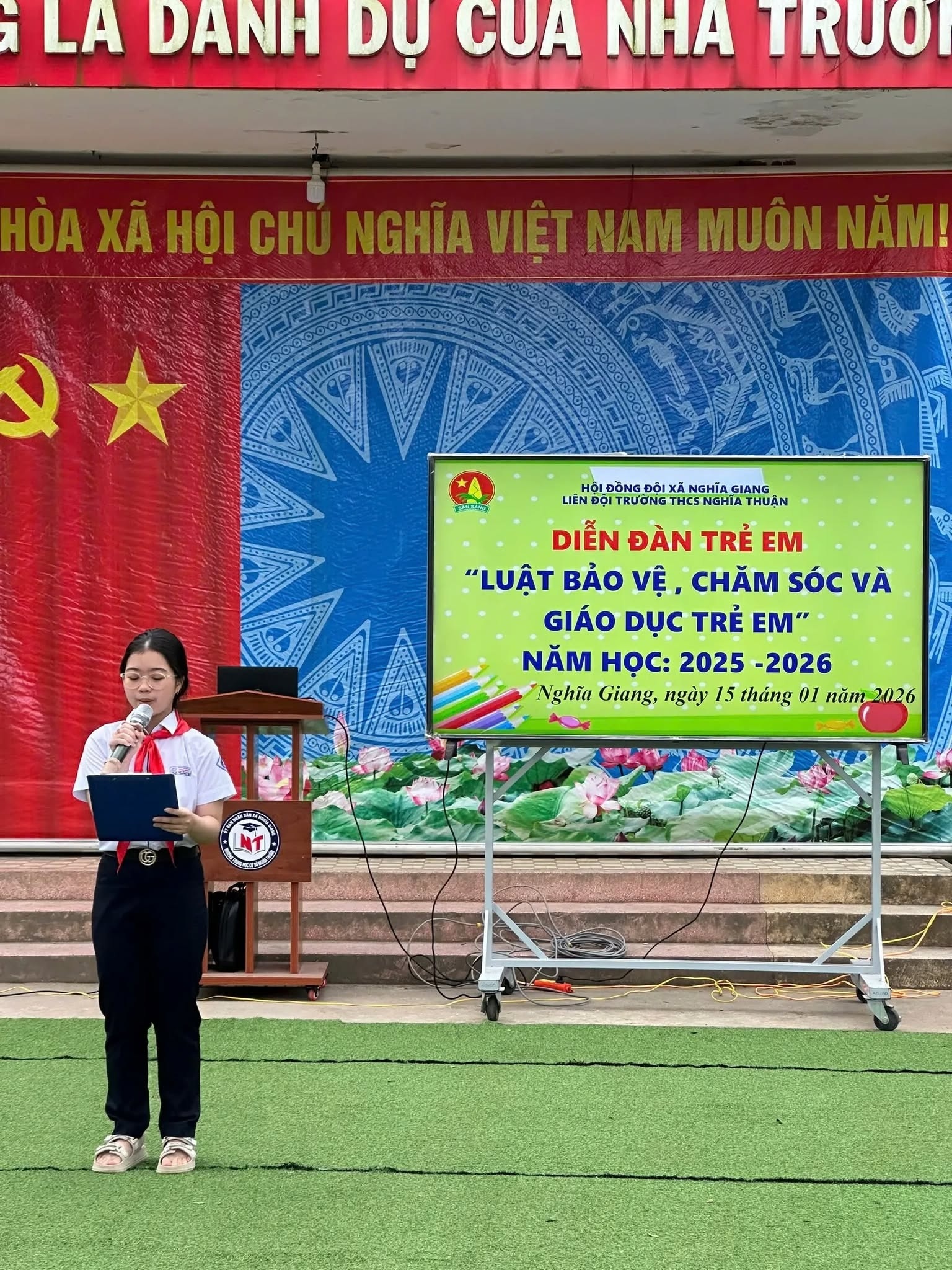 Sáng ngày 15/01/2026, Liên đội Trường THCS Nghĩa Thuận đã tổ chức Diễn đàn trẻ em với chủ đề “Luật Bảo vệ, chăm sóc và giáo dục trẻ em” trong không khí nghiêm túc, gần gũi và đầy ý nghĩa.